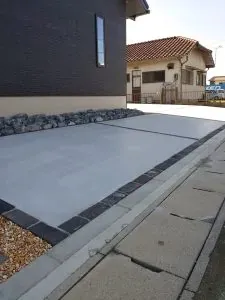 土間コンクリートだけだと、落ち着いた印象にはなりますが、スリットにも、化粧砂利で、色味も足しながら